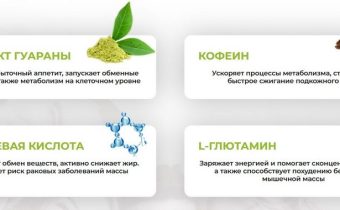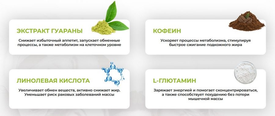 - Экстракт гуараны – улучшает обмен веществ, способствует клеточной регенерации. Компонент способствует снижению аппетита, повышает активность.