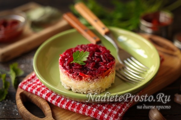 Сверху выложить свеклу. Ее майонезом можно не смазывать, как больше нравится.