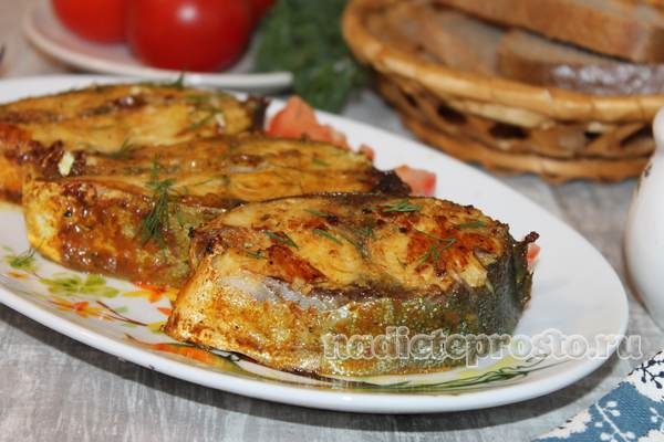 Тунец на прилавках в наших магазинах встречается в 2 видах: либо это цельная рыба, либо это уже разделанные на стейки куски мяса. Вы можете купить то, что вам больше нравится. На рыбке вообще нет чешуи, что упрощает ее готовку в разы. Чаще всего филе или тушка рыбы продаются в замороженном виде. Достаньте рыбу за несколько часов до приготовления, чтобы мясо немного оттаяло. В то же время нельзя давать ему растаять полностью, так как потом рыбу будет тяжело разделывать: она станет мягкой, будет деформироваться. Размораживать филе нужно только естественным путем, никаких микроволновок, горячей воды и прочих отогревающих приспособлений быть не должно. При неестественной разморозке мясо потеряет большую часть сока, и, как итог, станет сухим и безвкусным. Я купила целую большую рыбку. Прошло немного времени, а мясо уже заметно подтаяло, так что можно приступать к разделыванию. Отрежьте рыбью голову, чтоб она не мешала вам, по желанию, из нее можно потом сварить уху, но только не забудьте удалить жабры, иначе бульон у супа будет горьким на вкус. Некоторые хозяйки советуют рыбью голову замочить на полчаса в подсоленой воде, это убирает неприятный рыбий аромат. Брюшко рыбы вспорите, достаньте молоко, кишки. Промойте мясо под струей воды, чтобы оно не кровило.Нарежьте тунца небольшими кусками примерно одинакового размера. Их толщина не должна превышать 3 см, оптимально, если она будет около 2 см. Стейки рыбы промойте вновь под водой, сложите на плоскую тарелку и промокните бумажными полотенцами, нужно убрать лишнюю жидкость с мяса.Так как рыбные стейки нужно будет замариновать, приготовьте смесь. В глубокую чашку пересыпьте перечисленные специи. Если вы не любите куркуму или паприку, берите те, которые вам больше по вкусу. К рыбе отлично подходят тимьян, сушеный базилик, розмарин, сушеный чеснок. К специям прилейте кетчуп и соевый соус. Если кетчупа у вас не нашлось, его легко можно заменить томатной пастой, только немного разведите ее водой, если она слишком густая. Добавьте в маринад немного соли и черного молотого перца, все хорошо перемешайте. Аромат от маринада уже исходит невероятно аппетитный, так и хочется его скорее попробовать.Стейки тунца обмажьте с обеих сторон смесью для маринования. Сложите их в глубокую чашку, прикройте тарелкой или заверните пищевой пленкой, затем уберите чашку в холодильник или любое прохладное место. Мариновать рыбу нужно около часа, но, если вы подержите немного подольше, будет только лучше.Для обжарки возьмите глубокую большую сковородку, плесните в нее масла и поставьте на умеренный огонь. Как только масло зашкворчит, сложите стейки в сковородку, скрепите брюшки при помощи зубочистки, чтобы стейки получились аппетитной формы.Обжаривайте с каждой стороны кусочки по 3-4 минутки. Мясо красиво подрумянится за это время. Переложите жареного тунца на тарелочку, можно предварительно дно тарелки выложить салатными листьями, блюдо будет выглядеть красиво. Быстрее пробуйте рыбку, пока она горяченькая и не остыла. Соус к рыбе можно не делать, поскольку промаринованное филе само по себе очень сочное.